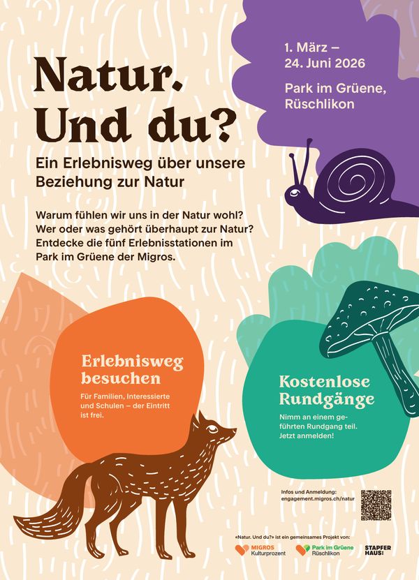 «Natur. Und du?» ist ein gemeinsames Projekt von Migros-Kulturprozent und dem Stapferhaus. Die Inhalte aus der Ausstellung «Natur. Und wir?» im Stapferhaus (2022-2024) sind neu aufbereitet für den Erlebnisweg in den Parks im Grünen. Er lädt ein, unsere Beziehung zur Natur zu reflektieren.